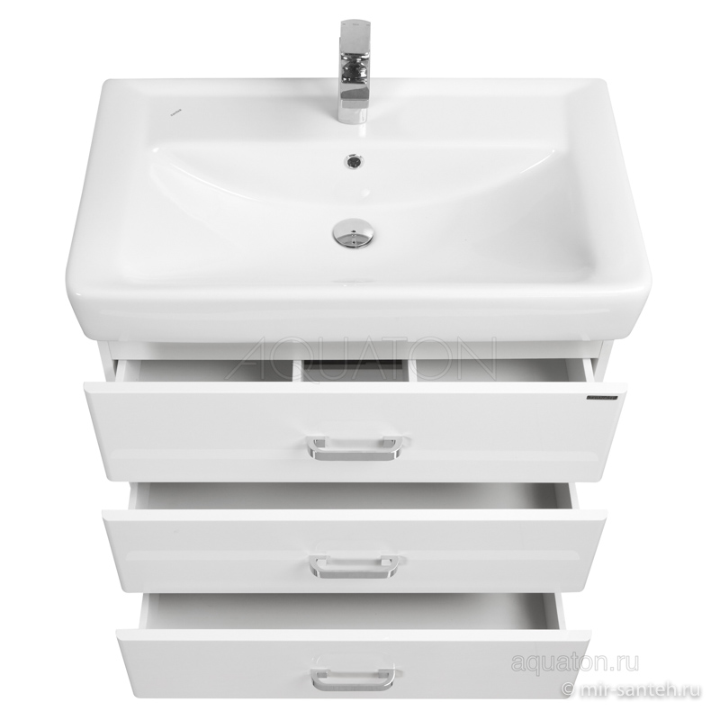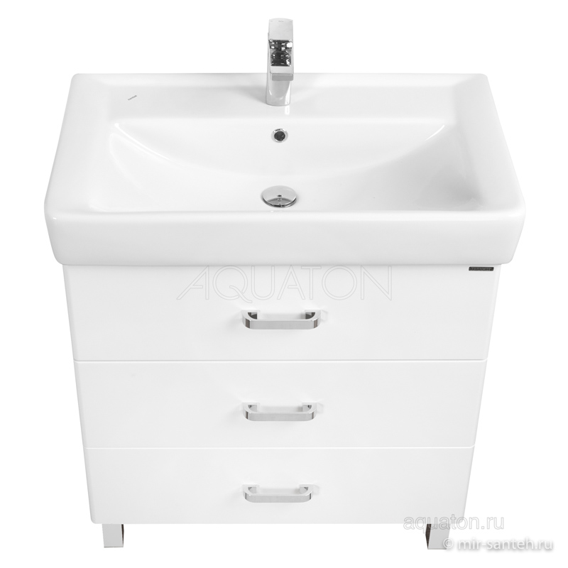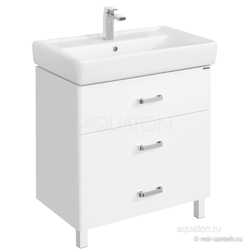 Современная лаконичная модель тумбы AQUATON Америна 80 Н шириной 80 см с двумя внешними ящиками и одним встроенным выполнена в белоснежном глянцевом цвете. Корпус изготовлен из влагостойкой ЛДСП, а фасад - из высококачественной МДФ. Тумбы данной модификации устанавливаются на ножки. Направляющие нижнего крепежа обеспечивают жёсткое и надежное крепление ящиков, а встроенные доводчики гарантируют их бесшумное и плавное закрывание. Дополнительно организовано нижнее подключение труб водоснабжения и канализации. Корпус и фасады покрыты полиэфирной краской ультрафиолетового отверждения, обеспечивающей дополнительную защиту от влаги.