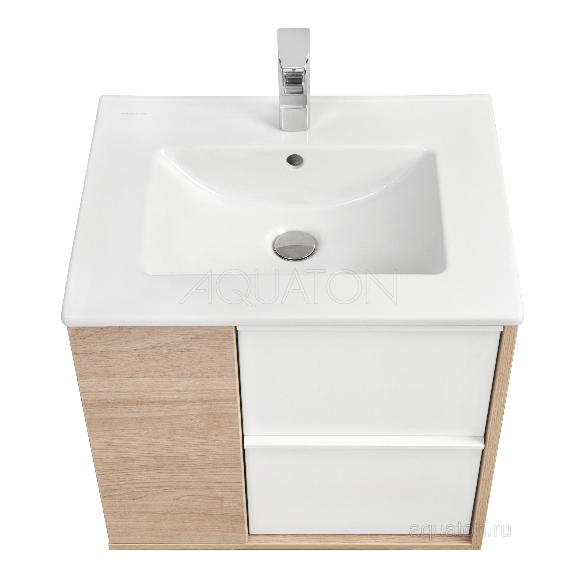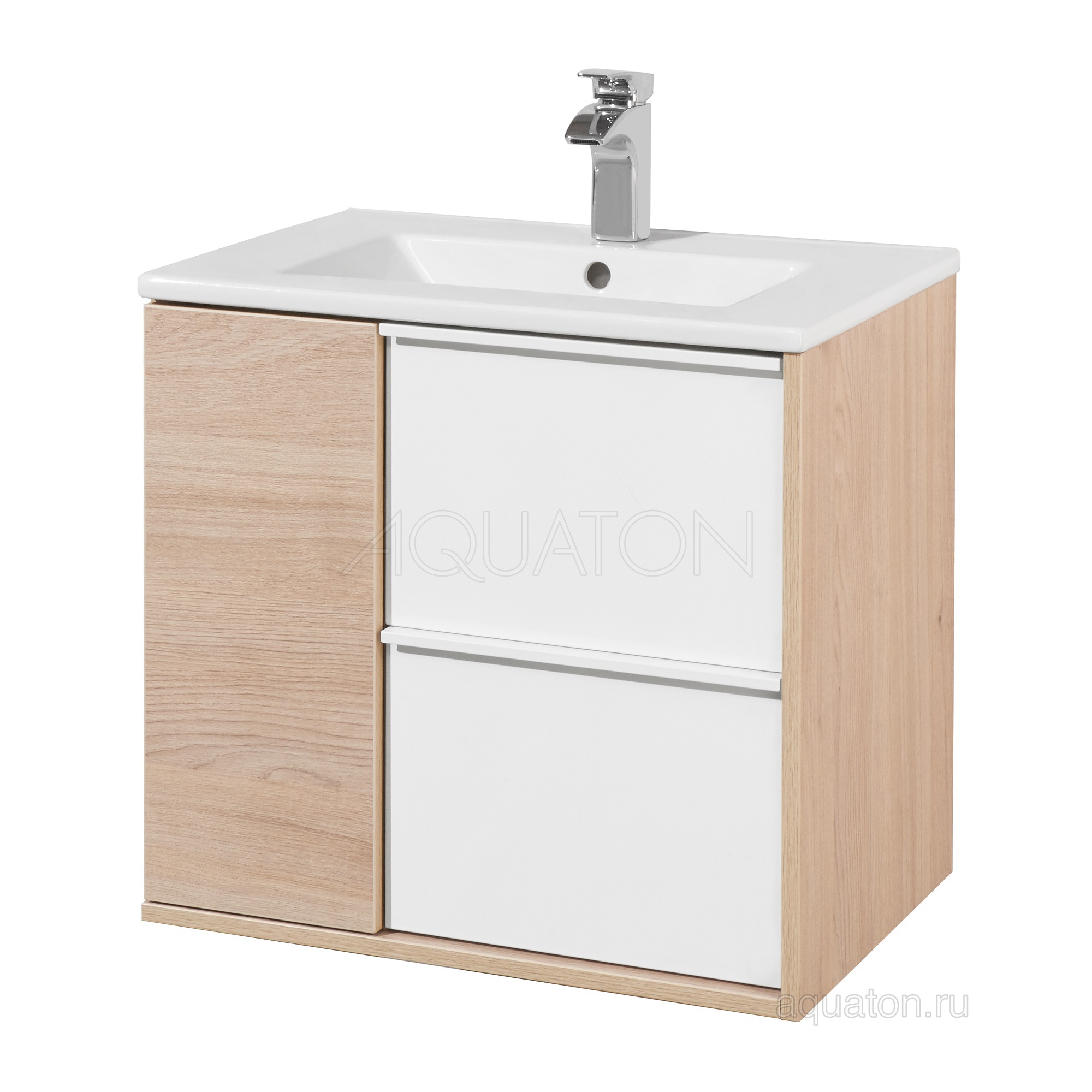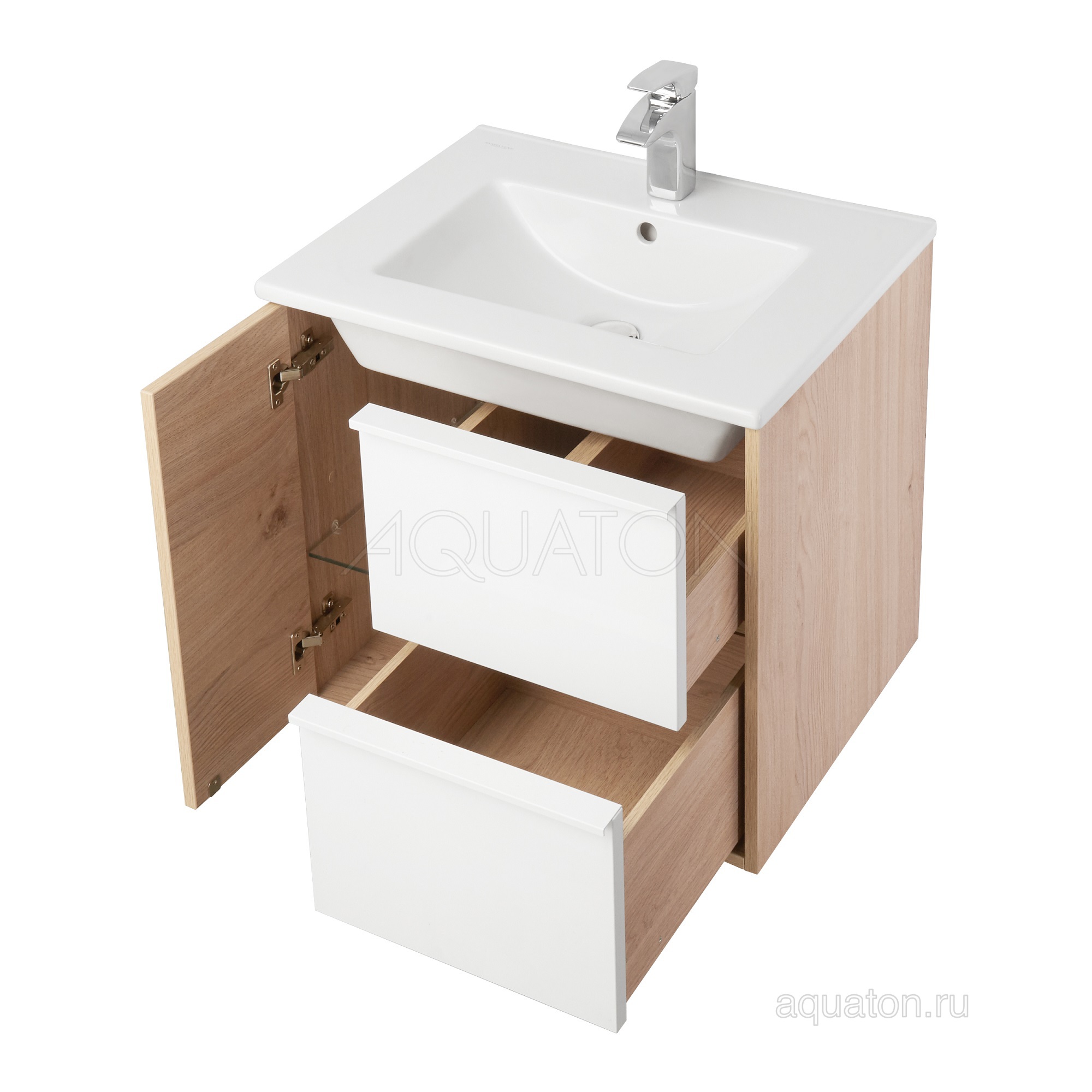 Элегантная тумба Бостон 60 от AQUATON в современном стиле сочетает в себе два цвета отделки - белоснежный глянец и древесный декор под натуральное дерево. Выполненная из влагостойкой ламинированной плиты тумба обладает простым и удобным функционалом. Слева за распашным фасадом-створкой, оснащенным системой push-to-open, находится отделение с регулируемой по высоте стеклянной полкой. Справа расположены белоснежные фасады двух ящиков с доводчиками, обеспечивающими их плавное выдвижение. Уравновешивает образ профильная ручка от европейского производителя. Дополнит комплект прямоугольная керамическая раковина Квадро.