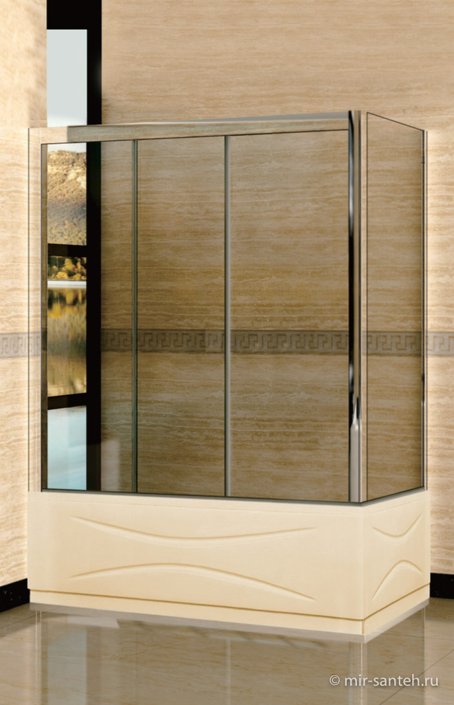 Шторка на ванну раздвижная трехстворчатая с боковым элементом Z-52. Стекло закаленное безопасное 4 мм. Три полотна стекла, два сдвижных и одно неподвижное. Регулируемые одинарные ролики. Магнитные уплотнители. Регулировка модели - 40 + 10 мм. Установка открытия двери с левой или правой стороны. Профиль анодированный алюминий. Цвет профиля - Хром полированный.