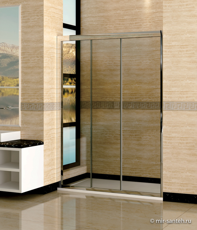 Раздвижная душевая дверь. Стекло закаленное безопасное 4 мм обработано Easy Clean. Три полотна стекла, два сдвижных и одно неподвижное. Регулируемые одинарные ролики. Магнитные уплотнители. Регулировка модели - 40 + 10 мм. Установка открытия двери с левой или правой стороны. Профиль анодированный алюминий. Цвет профиля - Хром. Имеет возможность изменить конструкцию на квадратную или прямоугольную, применив боковую панель RGW Z-12.