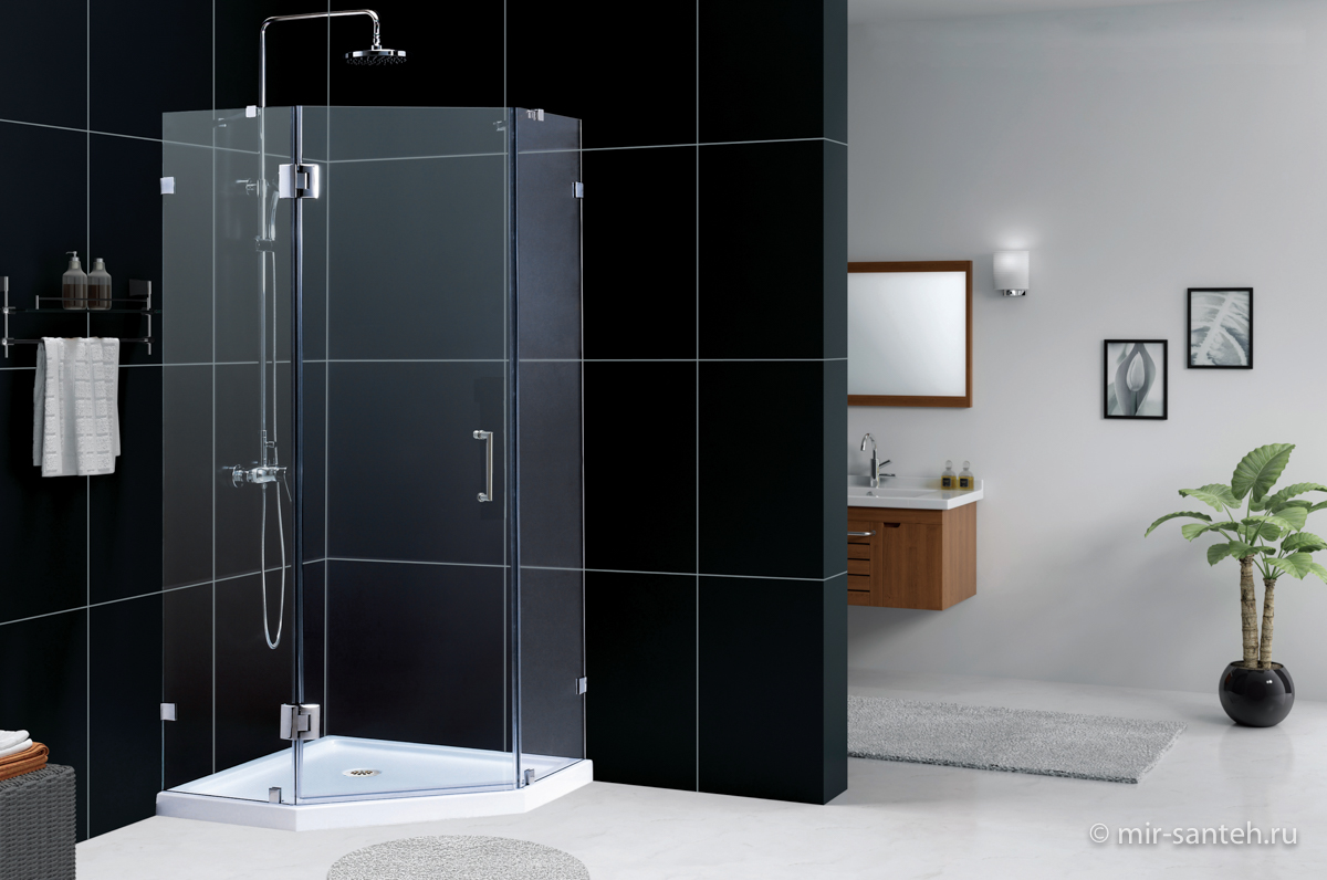Душевой уголок трапеция с распашной дверью. Стекло закаленное безопасное 8 мм. Стекло обработано покрытием Easy Clean. Распашная душевая дверь на петлях. Петли Хром. Пристенные регулируемые петли + 10 мм. Возможна установка душевой двери с открыванием как влево, так и вправо путем ее переворачивания. Силиконовые и магнитные водонепроницаемые уплотнители. Вверху кронштейны держатели стекла. Внизу коннекторы крепления боковых стекол к полу или поддону.